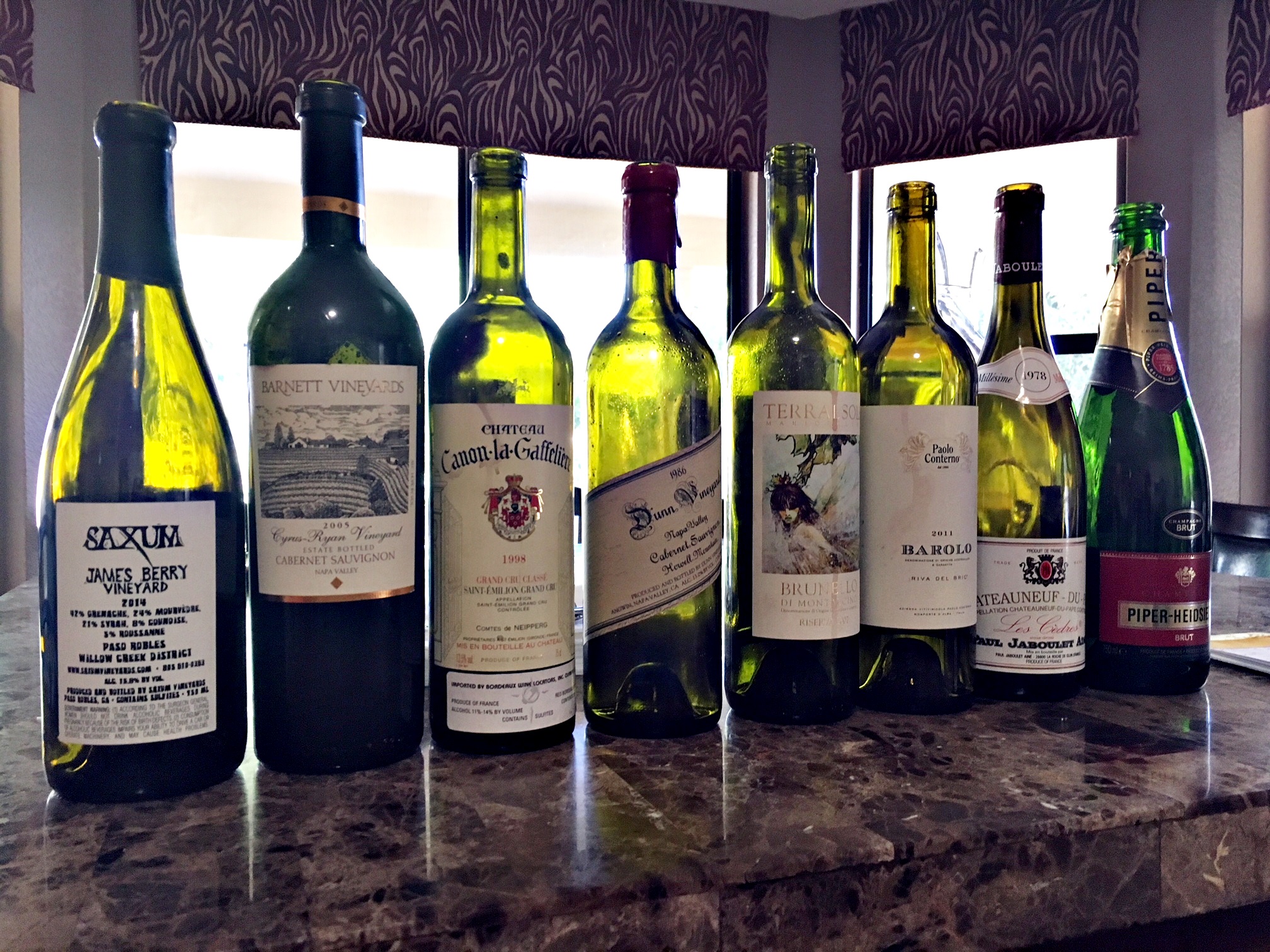 We wanted to taste these in order of power, complexity and nuance and one of our members who was tasked to sequence the wines was awfully close… in this order: CdP, Barolo, Brunello, Bordeaux, Dunn, Barnett and Saxum. The only change I would have made is swapping the order of the Barnett and Saxum.